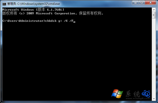 2、接著在cmd窗口中輸入“chkdsk g: /X /F”(其中的g為U盤所在磁盤,根據實際情況作出修改),按回車鍵即可。