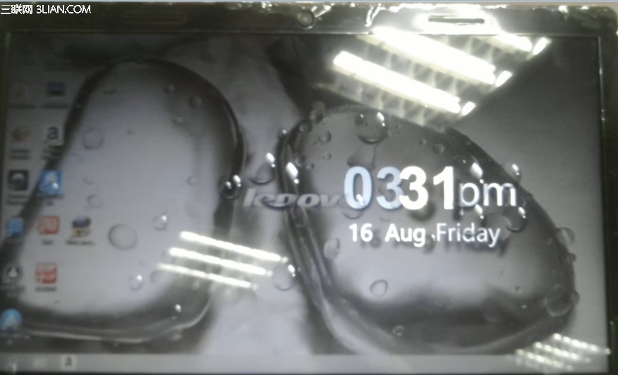 4、此時在Windows 8普通桌面下,使用三個或四個手指同時輕輕滑動觸控板,在桌面最上方會出現一道黑色幕簾,向下滑動即可以實現鎖屏功能(注意三個或四個手指同時輕輕滑動觸控板,不是按下 ),鎖屏效果如下(屏幕上為鎖屏的開始時間 )