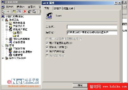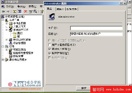 圖二 4、Administrator賬戶 NT系統有一個內建的系統管理員賬號Administrator,這個賬號對整個系統擁有最高級別的控制權,需要重點關注。不過Windows XP中這個賬號被隱藏了起來,而且該賬號的密碼是在安裝操作系統的時候輸入的。可能很多人並沒有意識到這一點,因此並沒有給Administrator賬號設置密碼,在這種情況下,只要有惡意的人能通過網絡或者直接接觸到你的電腦,那你的系統和數據就危險了。因此如果你的系統中該賬號密碼為空,最好給這個賬號設置一個密碼。另外,我們未必非用“Administrator”這個名稱不可。無論在Windows XP Home還是Pro版本中,最好創建另一個擁有全部權限的賬戶,然後停用Administrator賬戶。最後,不要忘記為所有賬戶設置足夠復雜的密碼。停用Administrator賬戶的方法如下:打開“控制面板”→“管理工具”,點擊“計算機管理”。在左邊列表中找到“本地用戶和組”並點擊其中的“用戶”,在右邊窗格中,雙擊Administrator賬戶,選中“賬戶已停用”即可(見圖3)。