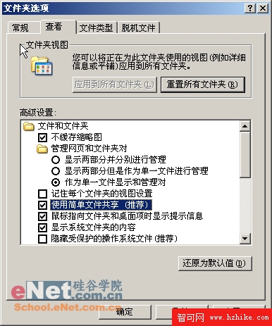 為了讓網絡上的用戶只需點擊幾下鼠標就可以實現文件共享,Windows XP加入了一種稱為“簡單文件共享”的功能,但同時也打開了許多NetBiOS漏洞。關閉簡單文件共享功能的步驟是:打開“我的電腦”,選擇菜單“工具”→“文件夾選項”,點擊“查看”,在“高級設置”中取消“使用簡單文件共享(推薦)”。